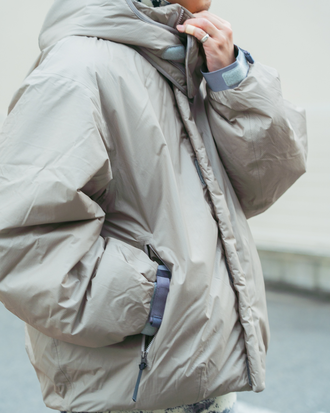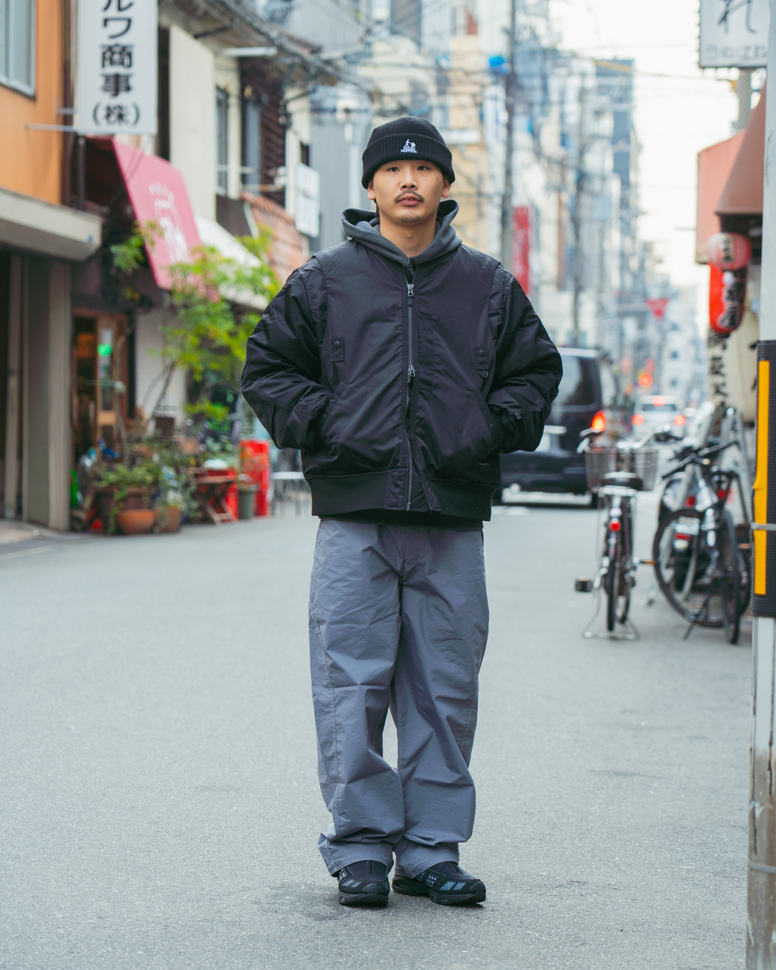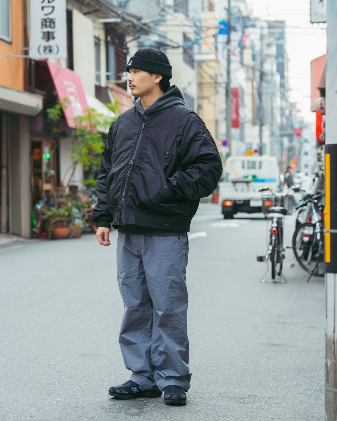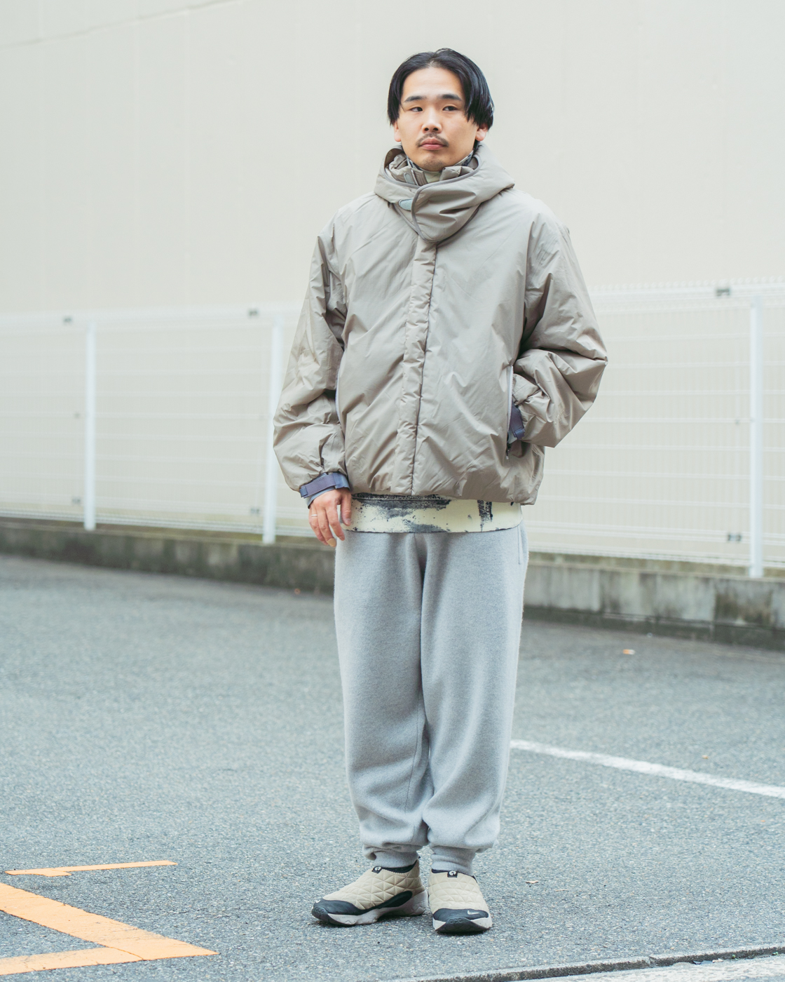 ジャケットに負けないハリ感とシャリ感のある生地でDAIWA PIER39との相性も良く、インナーのグレーフーディと色味を揃えることで、スタイリング全体にまとまりが生まれています。