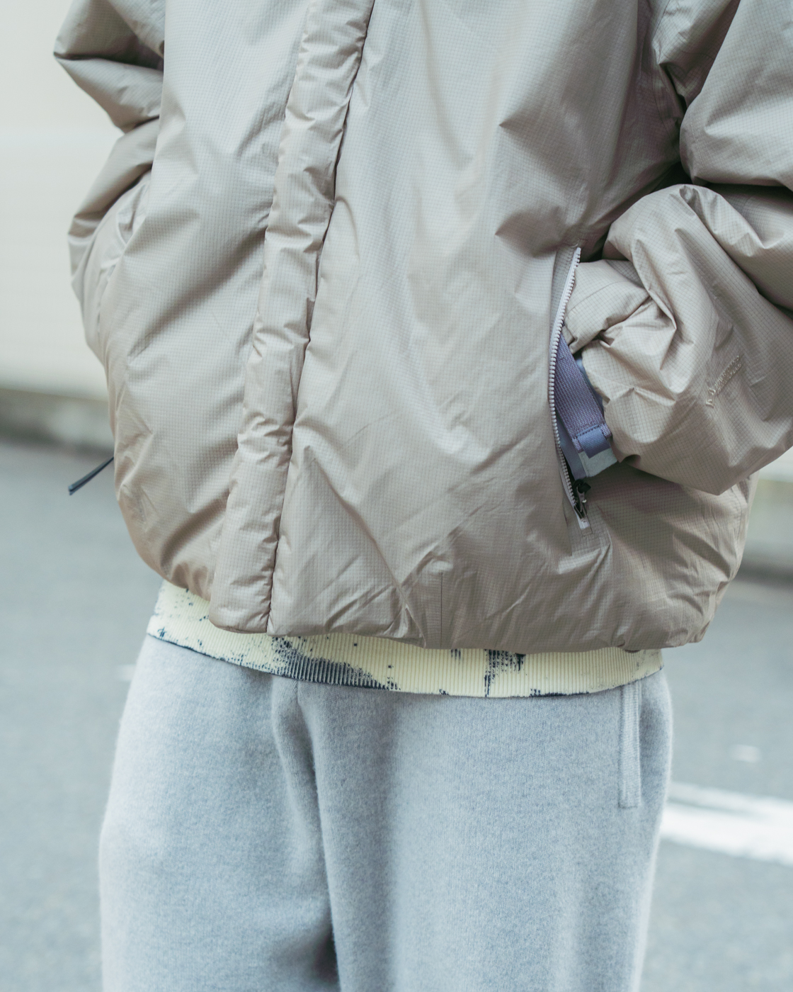 パンツにはBODHIのカシミヤスウェットパンツを合わせ、機能的なアウターと存在感のあるインナーをバランスよく繋いでいます。